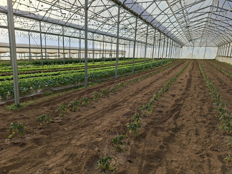 Au premier plan : des rangs de tomates fraîchement plantées pointent le bout de leur nez, la saison sera-t-elle prometteuse ? Réponse d’ici quelques semaines.
